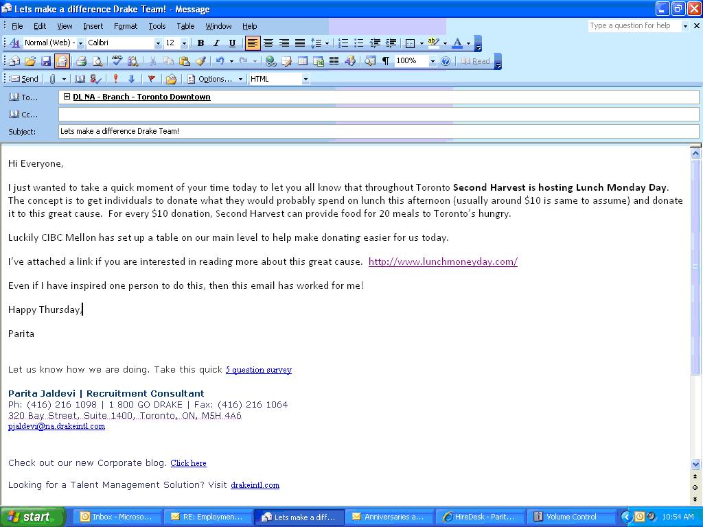 I took it upon myself to send a mass email to the entire office to hopefully motivate some people to make a difference today! You should do the same!!!! Time is ticking, check out my email below… if you feel insired DO THE SAME or find a second harvest location and participate!!!!