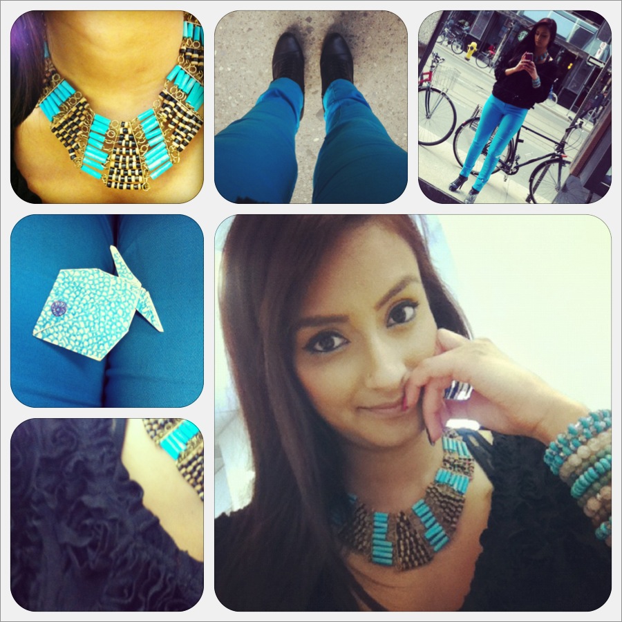 Outfit: Black rose top (American Apparel $98.00), turquoise pants (M for Mendocino $49.00), necklace (le Chateau $9.99), bracelets (Me!), black boots (Nine West $29.99 STEAL)