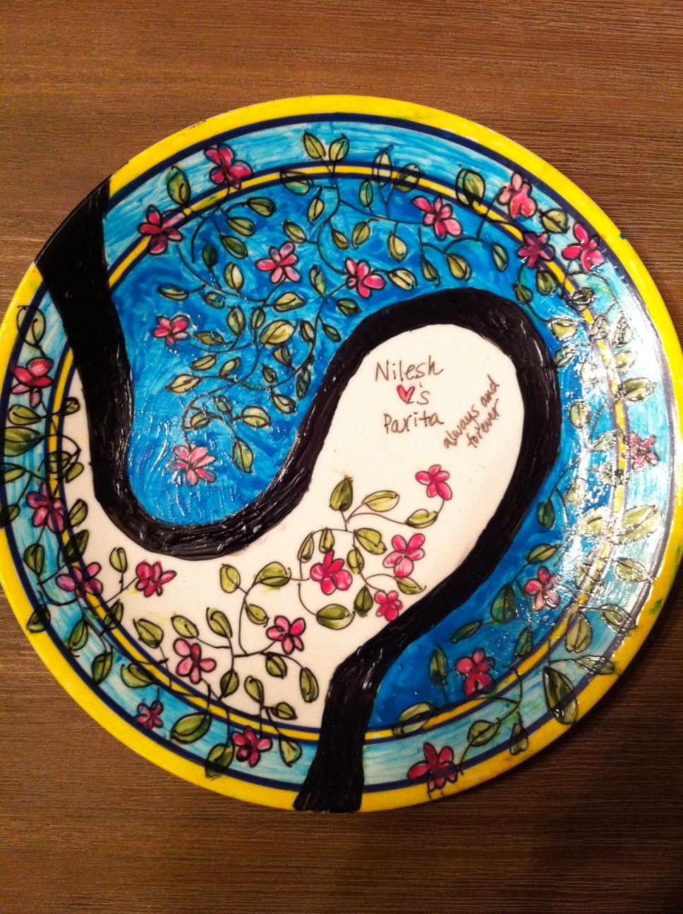 While cleaning out a cabinet today I came across some memories from one of our first dates. Now knowing him better than ever, i’m sure this wasn’t the funniest thing for him to do, but you would of never second guessed it that night. Over a couple glasses of wine, some music in the background, candles (ohhh la la) we painted our little hearts out on plates at home. Ceramic paint, to be exact. All you have to do is throw it in the oven when your done to set the paint and you can actually eat off of it after. We don’t, as they are our master pieces, but food for thoughts.