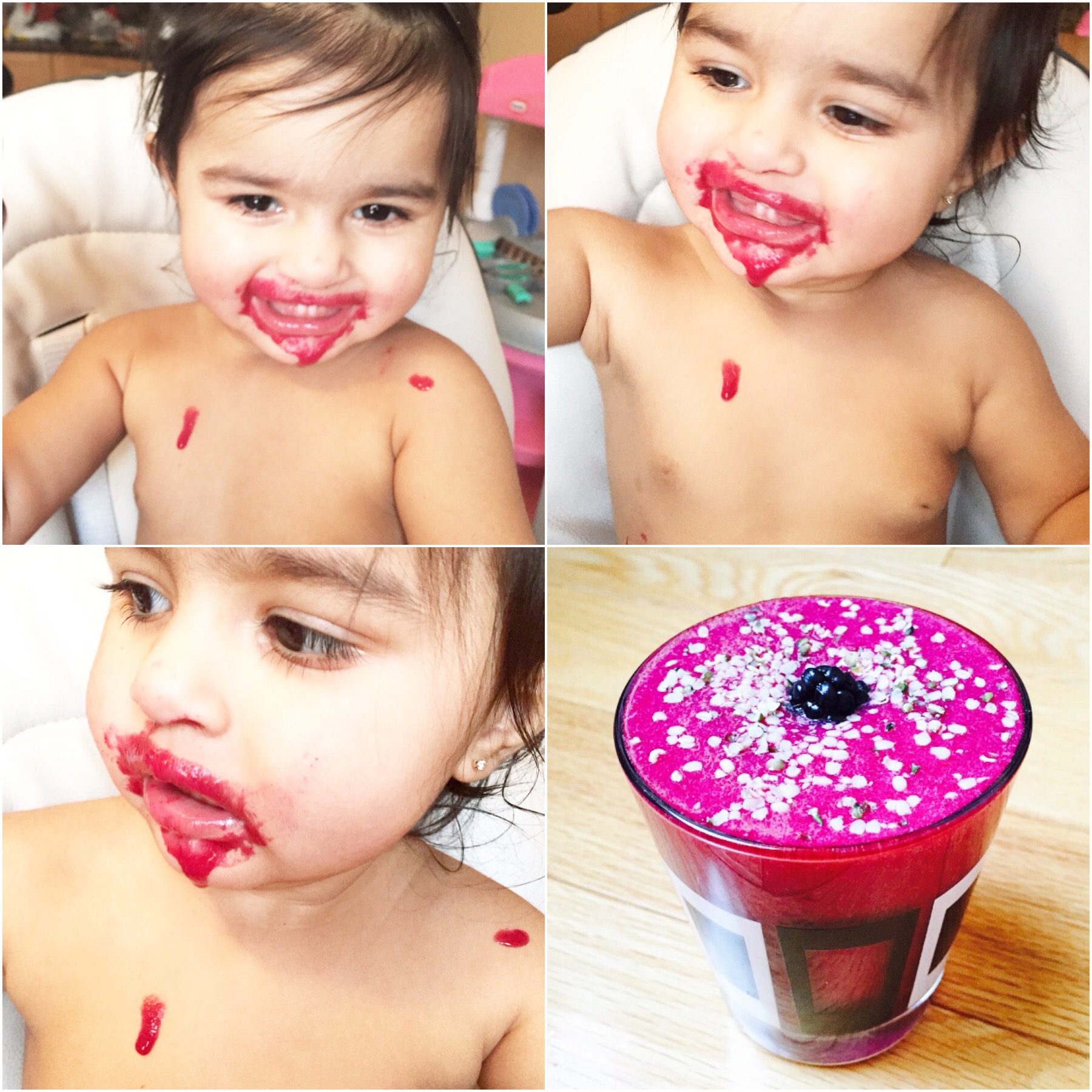 The real test was Angelina though. As soon as she saw the colour she gave me the universal sign for momma I need you to hook me up NOW! I gave her a spoonful straight from the blender. She loved it and wanted more ASAP. Since beets stain, I took her shirt off and this girl went to Healthy Town! I totally recommend everyone to try this. Give your body and your kiddos some good vibrations!
