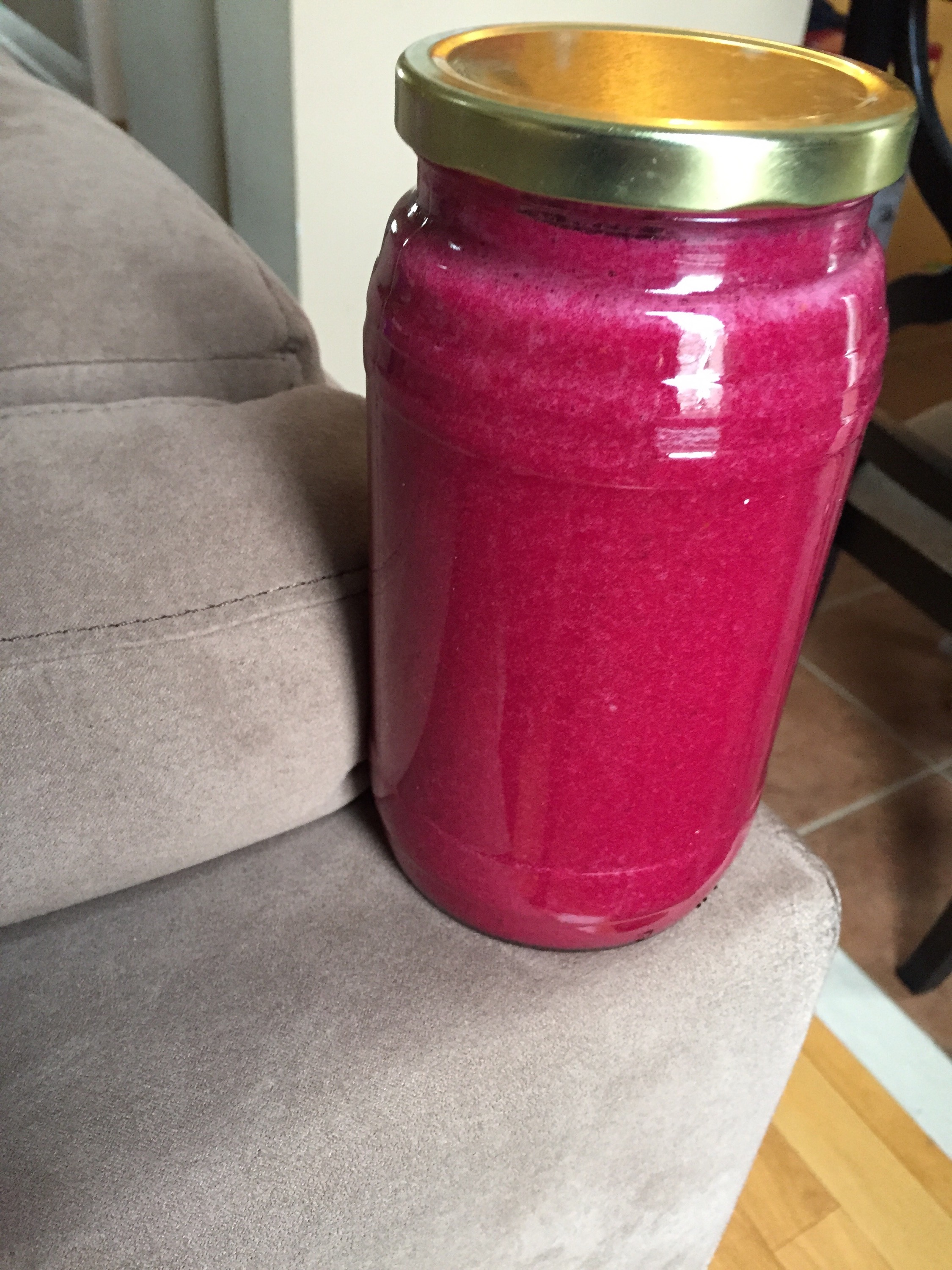I found a couple recipes on Pinterest and felt inspired, so I started throwing fruits and vegetables in my Vitamix. What I came up with was not only BEAUTIFUL but delicious! The colour is gorgeous. Like I need a lipstick in this colour immediately. It’s just so pretty. And the taste… Mama Mia!
