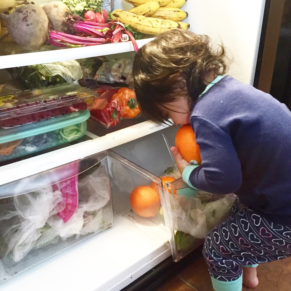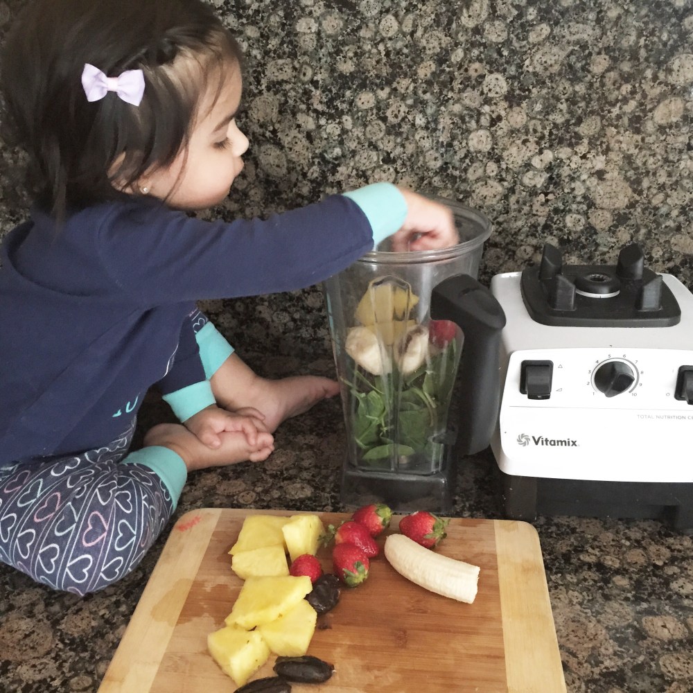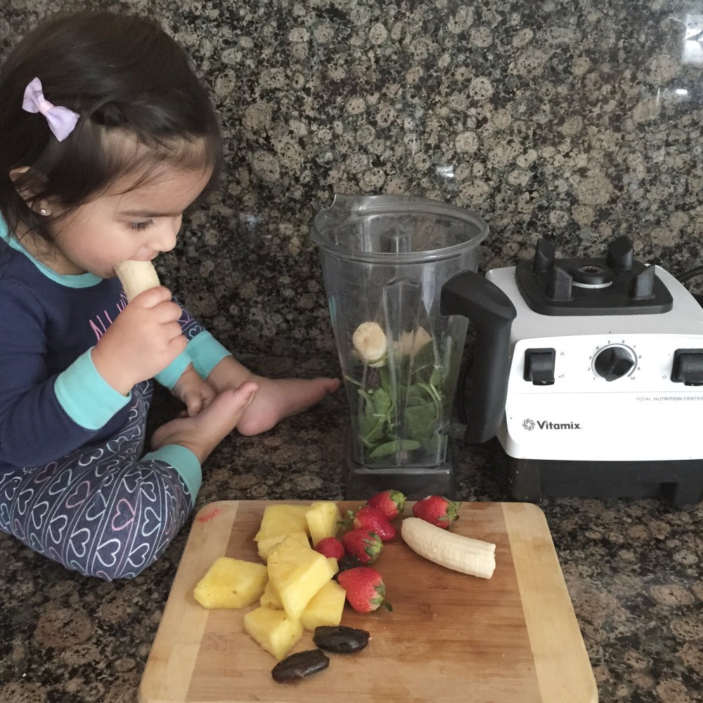 Our morning routine is the same every day! She stands by my feet like clock work while I prep the fruits and veggies for our smoothie, knowing her turn is up next. Once everything is prepped and knives are put away, she gets to do the rest. Putting everything in the Vitamix, while doing a taste lick or bite on almost everything she puts in. She needs to ensure quality people!!!